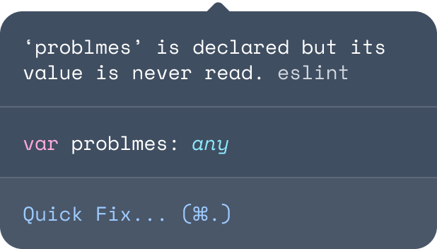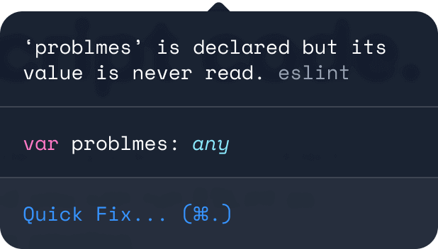 Aprenda más de encontrar errores con ESLintMuchos problemas que encuentra ESLint se pueden solucionar automáticamente. Las correcciones de ESLint son consciente de la sintaxis para que no experimente errores introducidos por los tradicionales algoritmos de encontrar y reemplazar.